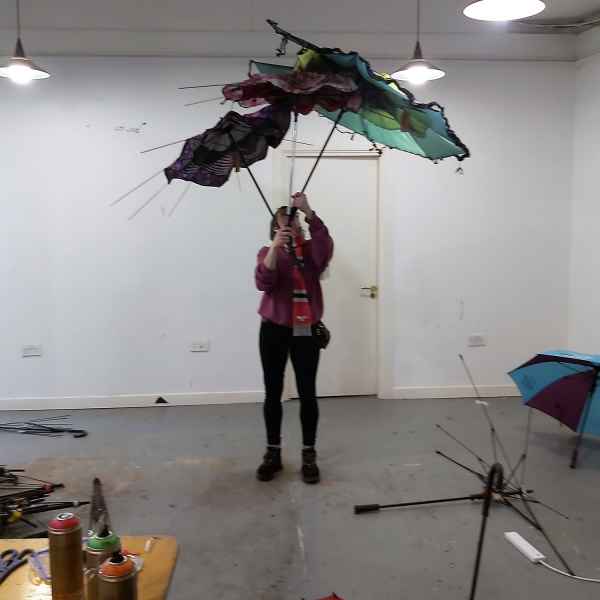Throughout this Autumn and Winter 2019 we collected broken and discarded umbrellas using our umbrella collecting bins in locations around Galway city. Starting in October, we hosted deconstructing umbrella workshops; taking umbrellas apart into component parts ready for reconstruction. In Spring 2020 Jeni, supported by community participants, created a series of designs using the deconstructed elements of the collected umbrellas as the materials.