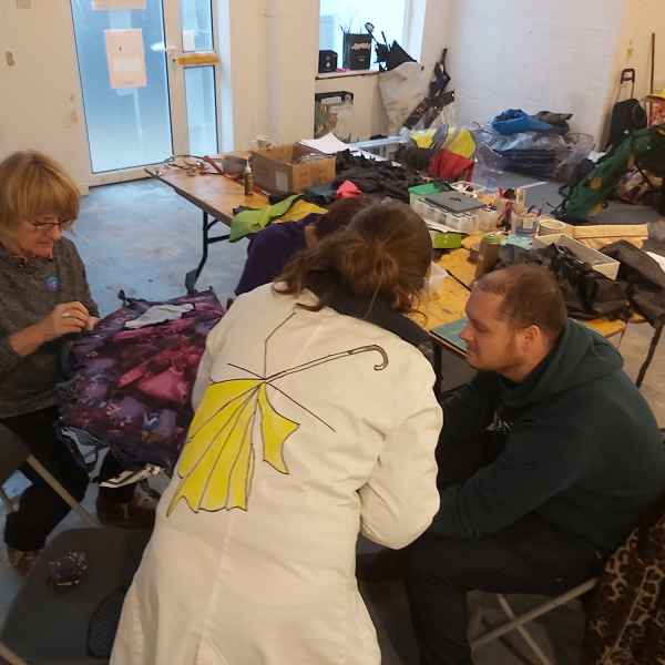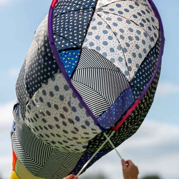 In this project created by Jeni Roddy, we re-use and re-purpose broken umbrellas found in Galway, we dismantle them and create new designs with the materials. Designs developed during the project include shelters, flying objects, even Covid-19 hacks. We learn design and sewing skills, as well as share upcycling and recycling skills, in a very sociable and caring setting.