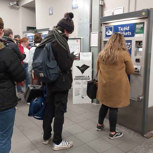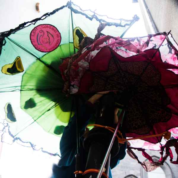 I rith an fhómhair agus geimhridh 2019, bhailigh muintir na Gallimhe 667 scáth báistí a raibh briste ag na gálaí gaoithe. Ón fhómhair ar aghaidh chuireamar ceardlainn poiblí ar siúl agus bhaineamar na scáthanna báistí as a chéile. B’shin 54kg miotal agus 667m2 éadach ar shábháil muid ón mbrúscar. Le cabhair ón phobal rinne an t-ealaíontóir Jenni Roddy athchóiriú mar shaothair nua ealaíne ar na shean-scáthanna báistí.